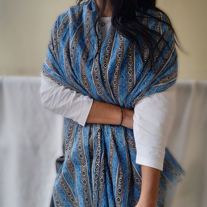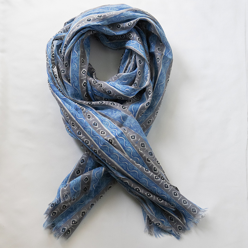 Εσάρπα 100% από βαμβάκι, διαστάσεων 100cm x 180cm, σε συνδυασμό μπλε, γκρι και μαύρου χρώματος. Το pattern design είναι εμπνευσμένο από την Αρχαία Ελλάδα.