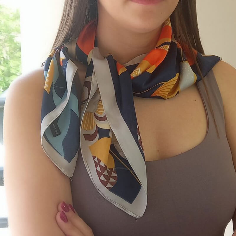 Φουλάρι silk feeling, διαστάσεων 70 cm x 70 cm, σε συνδυασμό μπλε, πορτοκαλί, μπεζ, λευκού, γαλάζιου χρωμάτων.