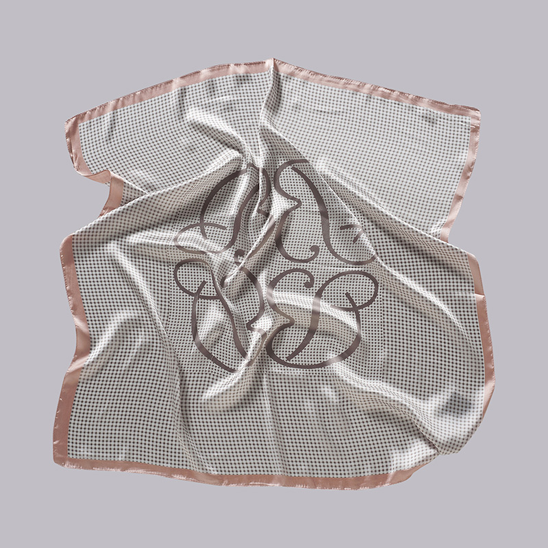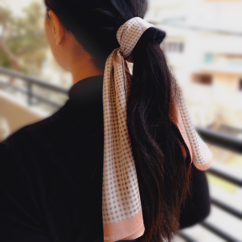 Φουλάρι silk feeling, διαστάσεων 70cm x 70cm, σε συνδυασμό μπεζ, ροζ και εκρού χρώματος.