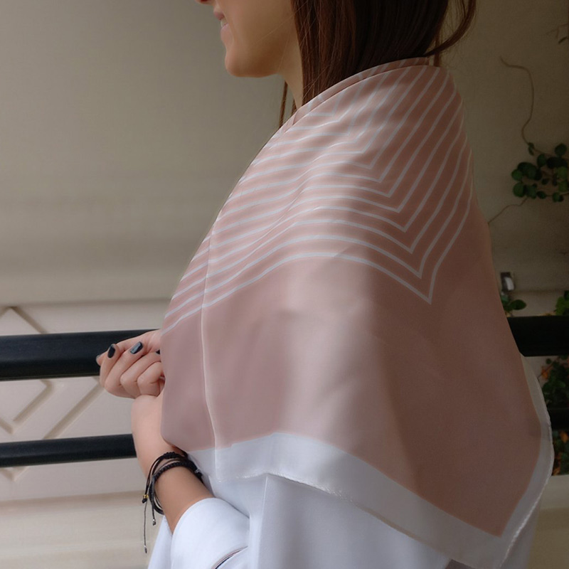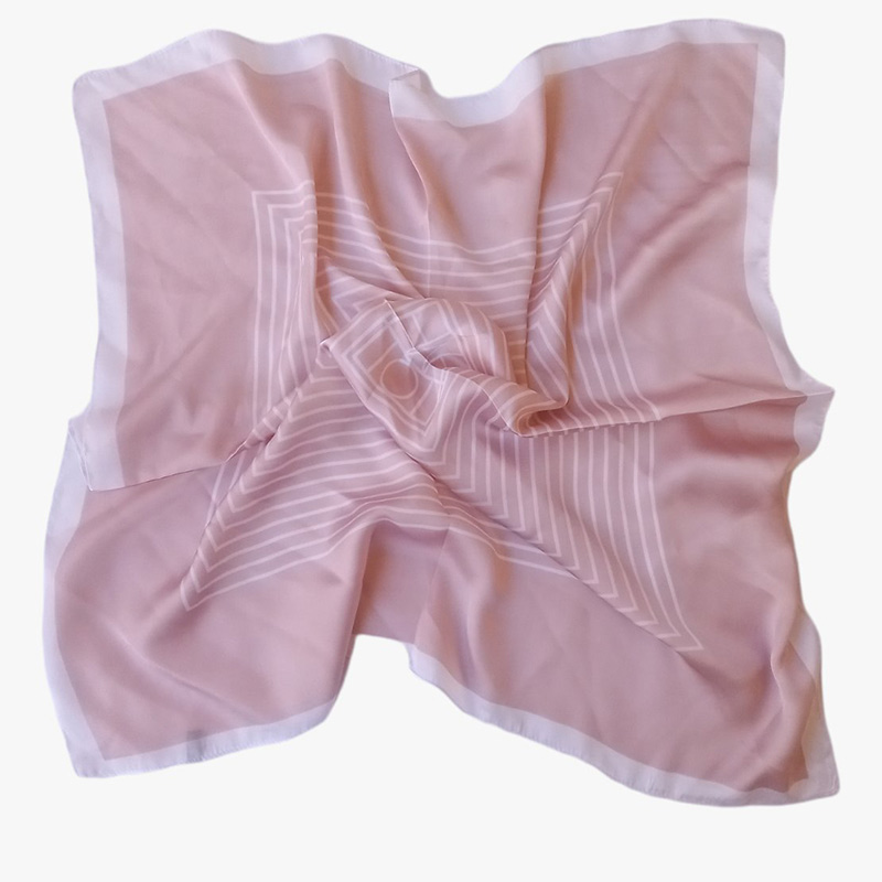Φουλάρι silk feeling, διαστάσεων 70cm x 70cm, ροζ – σομόν χρώματος, σε λευκό περίγραμμα.