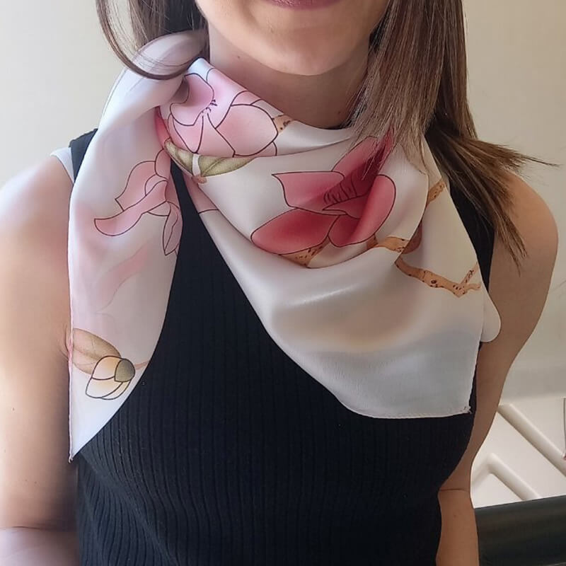 Φουλάρι silk feeling διαστάσεων 70 cm x 70 cm, σε συνδυασμό μπεζ, ροζ και φούξια χρωμάτων.