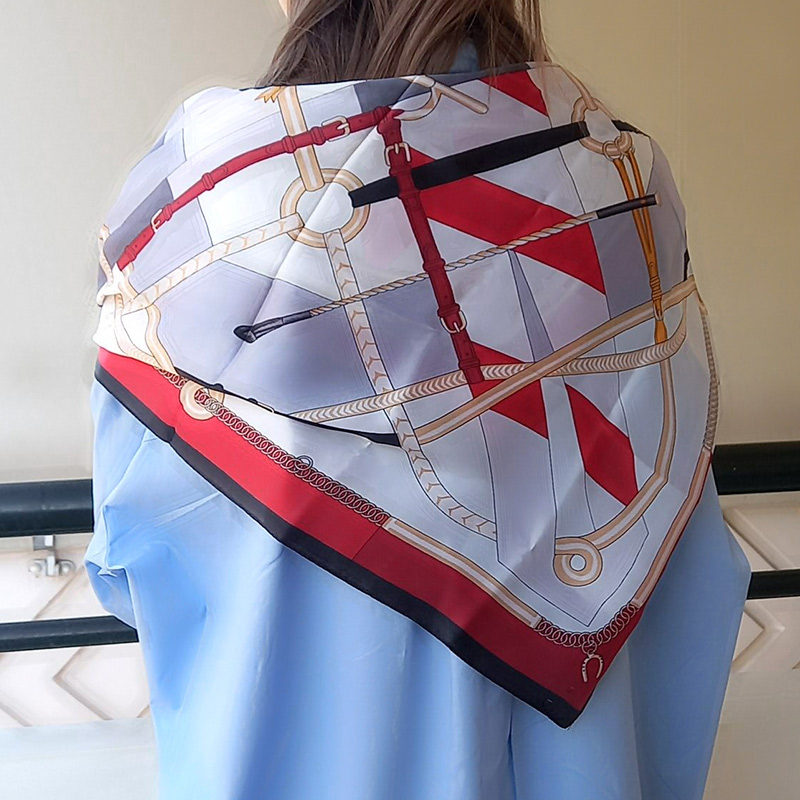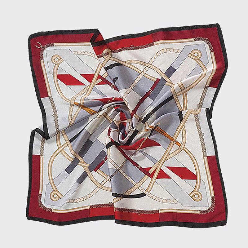 Φουλάρι silk feeling, διαστάσεων 70cm x 70cm, με κλασσικό pattern design, σε συνδυασμό κόκκινου, γκρι και μπλε χρώματος.