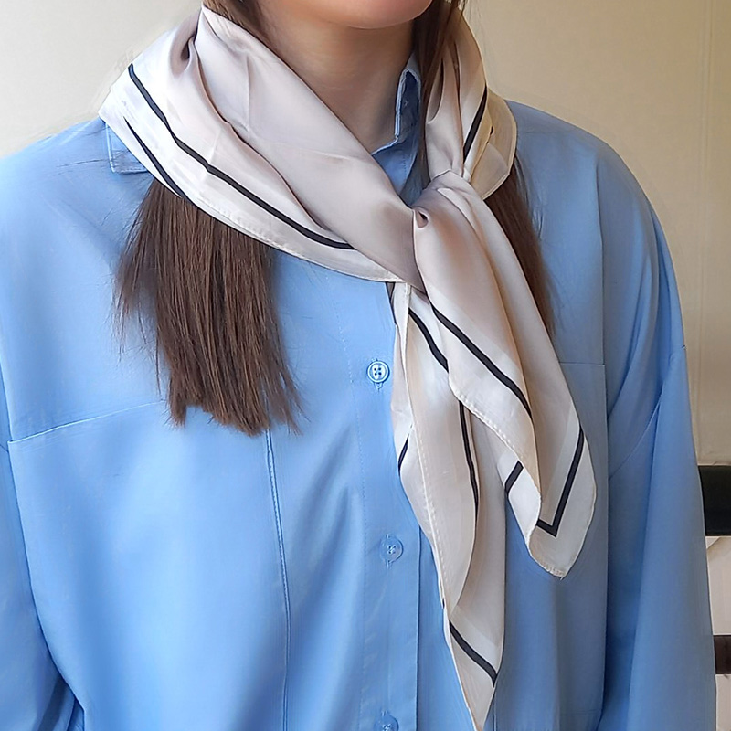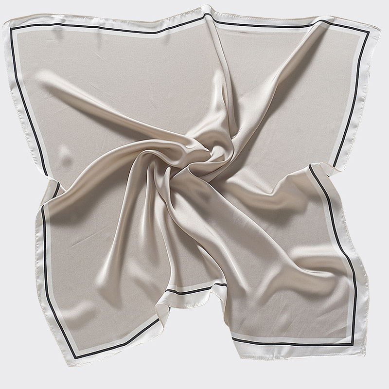 Φουλάρι silk feeling, διαστάσεων 70cm x 70cm, σε συνδυασμό δύο αποχρώσεων μπεζ χρώματος με μαύρο περίγραμμα.