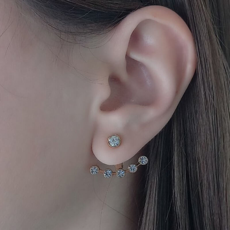Σκουλαρίκια ατσάλινα χρυσού χρώματος, τύπου jacket δύο θέσεων, διακοσμημένα με strass. Διαθέτουν κούμπωμα “καρφάκι”.