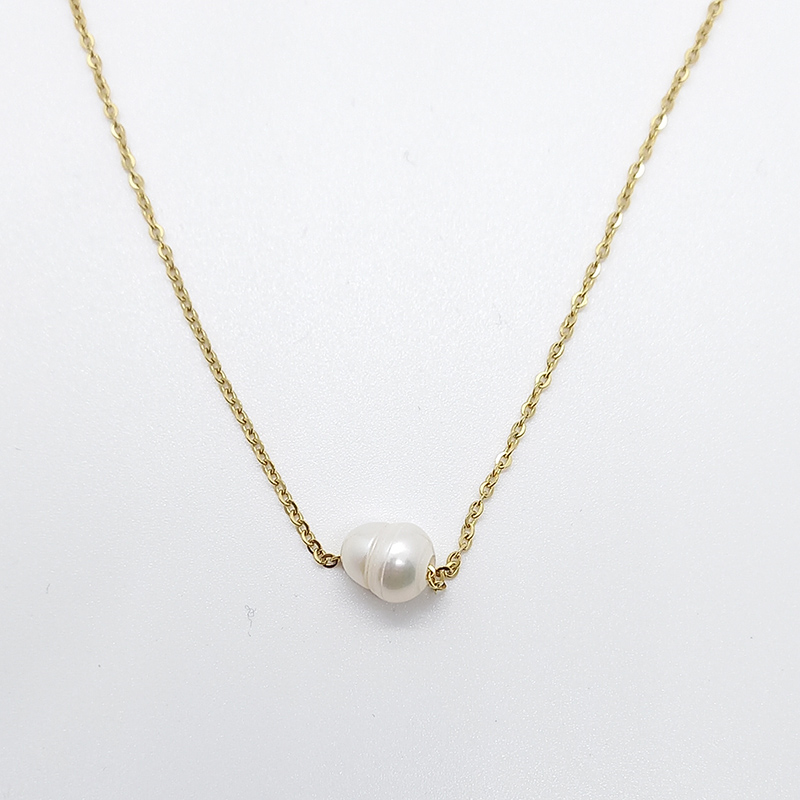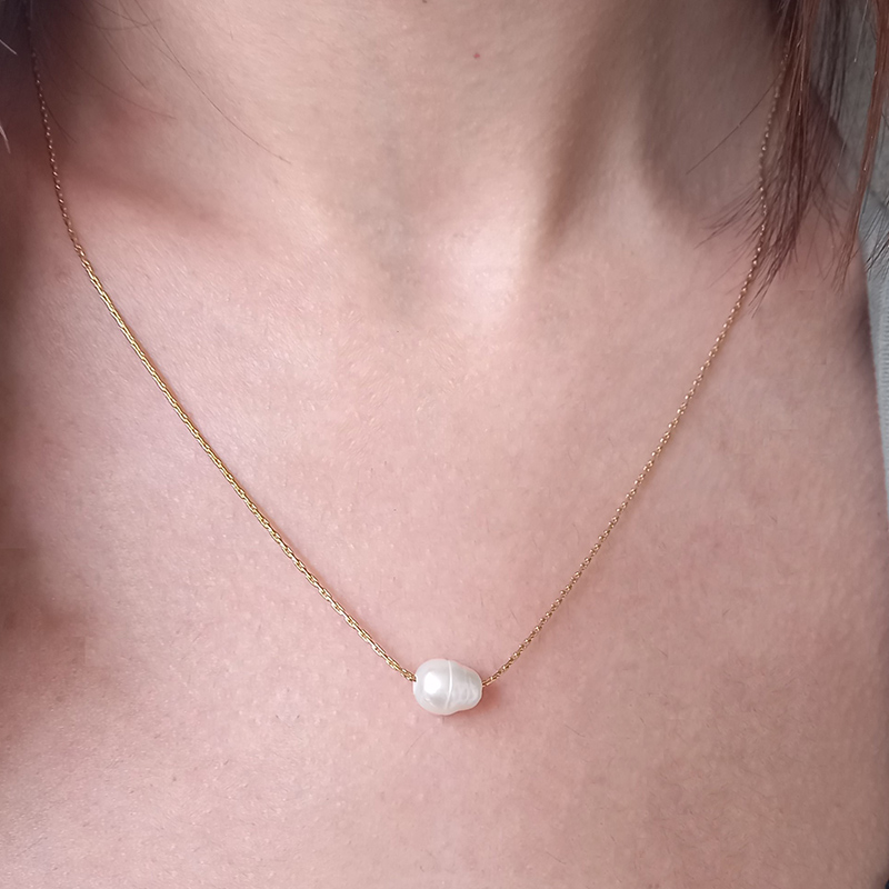 Κολιέ από ατσάλι, σε χρώμα χρυσού, σε αλυσίδα μήκους 49cm, η οποία συγκρατεί λευκό μαργαριτάρι.