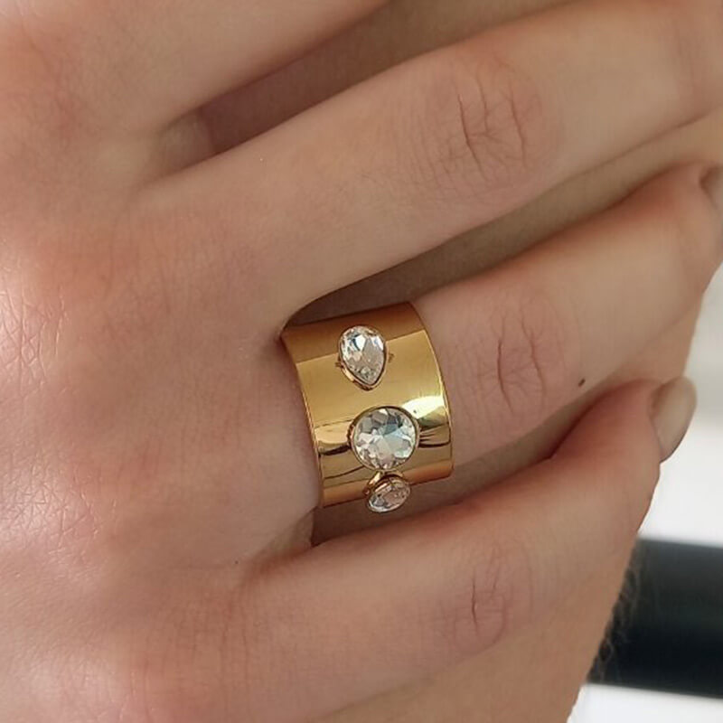 Δαχτυλίδι ατσάλινο χρυσού χρώματος, πάχους 1,5 cm, διακοσμημένο με λευκά strass. Προσαρμόζεται στο μέγεθος του δακτύλου.