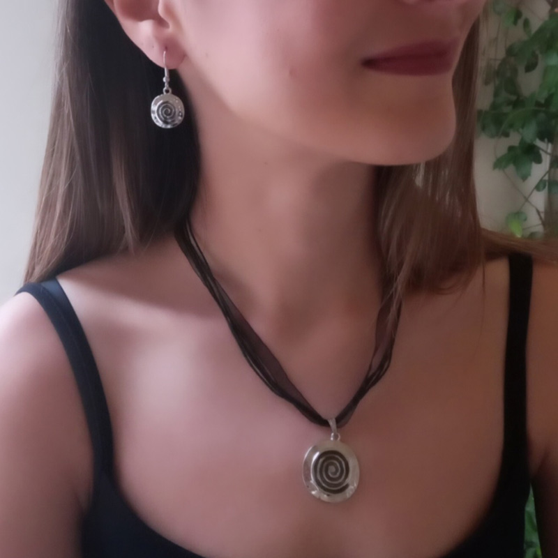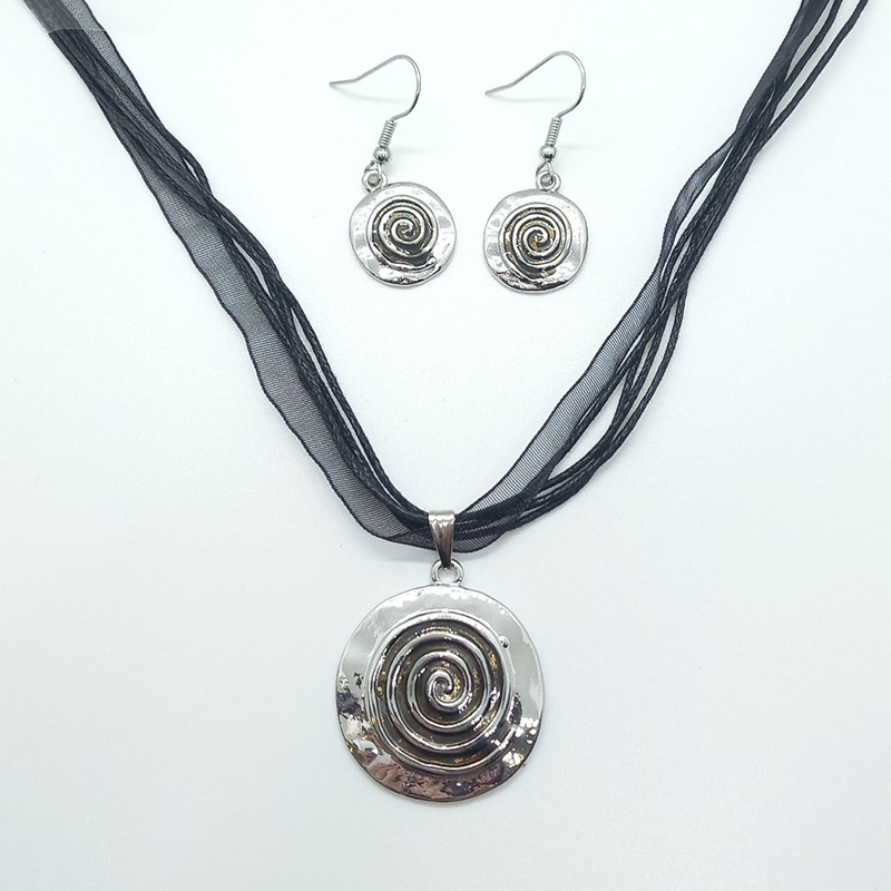 Set από κολιέ επαργυρωμένου ορείχαλκου σε κολιέ με τέσσερα κερωμένα κορδόνια και σατέν – τούλινη κορδέλα, μήκους 47,00 cm, σε μαύρο χρώμα, τα οποία συγκρατούν στοιχείο επάργυρο, διαμέτρου 3,0 cm, διακοσμημένο με επένδυση θερμού σμάλτου και χάραξη σε σχήμα σπείρας, μαύρου χρώματος. Επίσης, περιλαμβάνει σκουλαρίκια κρεμαστά, επάργυρα, διαμέτρου 1,5 cm και συνολικού μήκους 3,50 cm με την ίδια επένδυση.