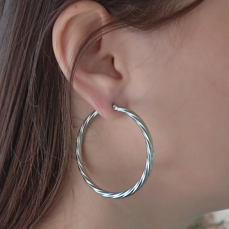 Σκουλαρίκια ατσάλινα ασημί χρώματος, κλασικοί κρίκοι, στριφτού μοτίφ, διαμέτρου 4,7 cm και πάχους 0,3 cm.