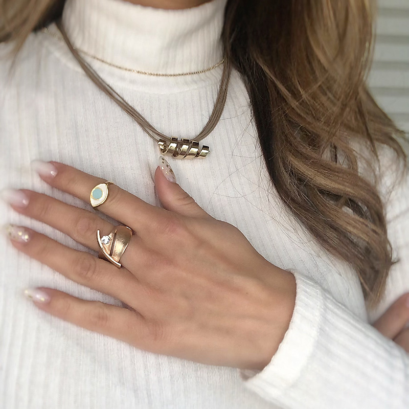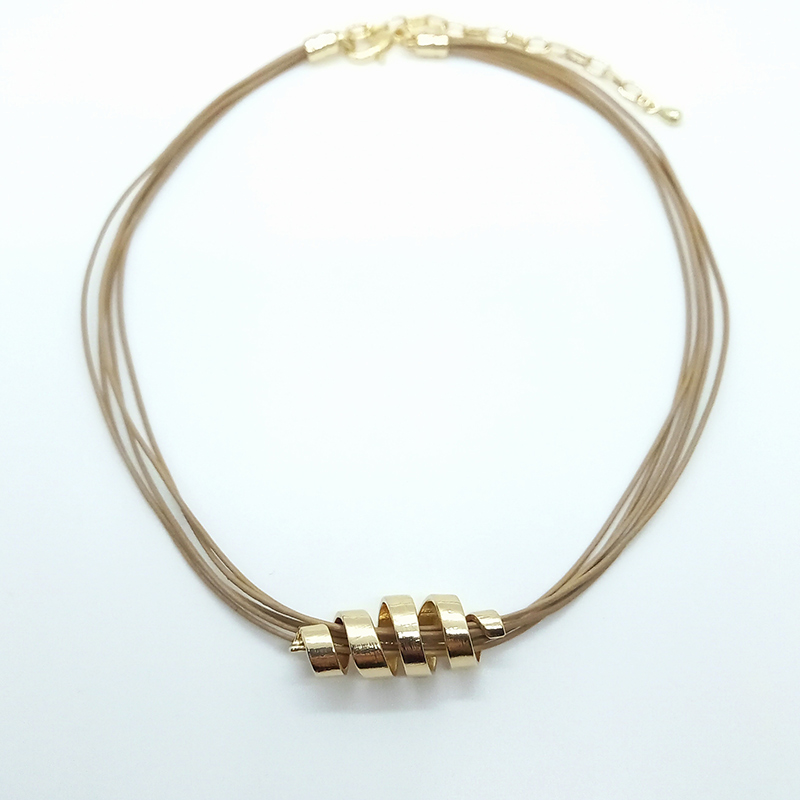 Κολιέ δερμάτινο πενταπλής σειράς στο χρώμα του πούρου, το οποίο διακοσμείται από επίχρυσο σπιράλ στοιχείο μήκους 4cm. Συνολικό μήκος δέρματος με προέκταση αλυσίδας 50cm.