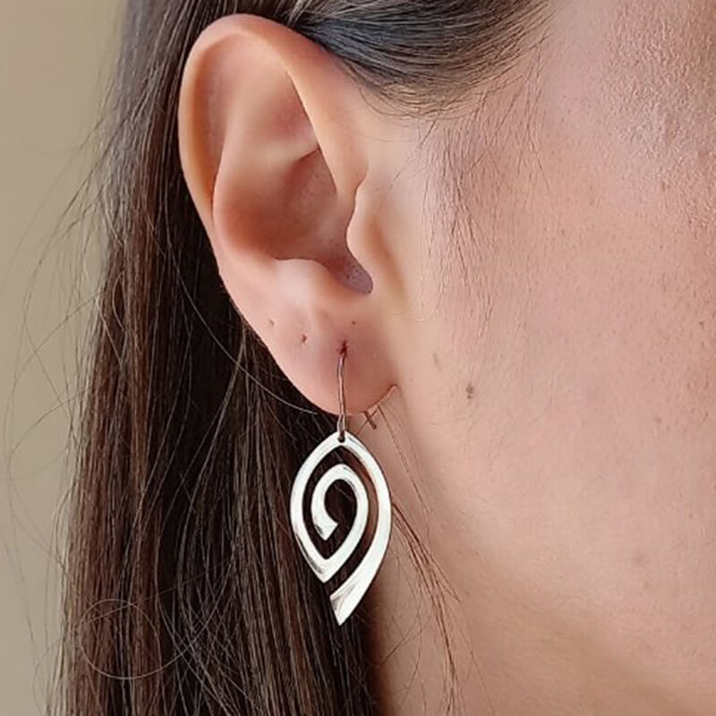 Σκουλαρίκια ατσάλινα ασημί χρώματος, κρεμαστά, συνολικού μήκους 4,0 cm σε σχήμα “φύλλου” γραμμικού σχεδίου.