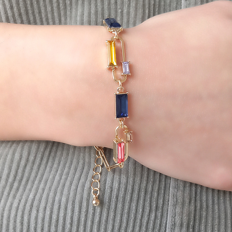 Βραχιόλι χεριού επιχρυσωμένου ορείχαλκου με κλασική αλυσίδα και τέσσερα κρύσταλλα. Τα δύο σχήματος παραμάνας, σε χρώμα κίτρινο και κόκκινο και τα άλλα δύο μπλε χρώματος, μήκους 22cm.
