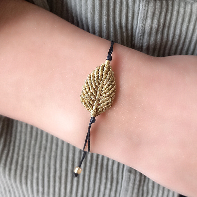 Βραχιόλι χεριού χειροποίητο μακραμέ, με μαύρη κλωστή και πλέξη χρυσού χρώματος σε σχήμα φύλλου.