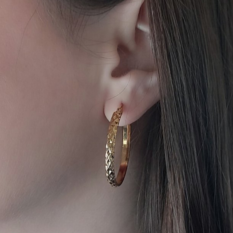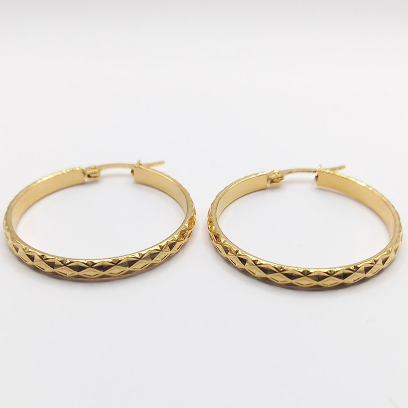 Σκουλαρίκια από ατσάλι χρυσού χρώματος, κλασσικός κρίκος διαμέτρου 3,3 cm και πάχους 0,3 cm, με ελαφρά χάραξη στην επιφάνειά τους.