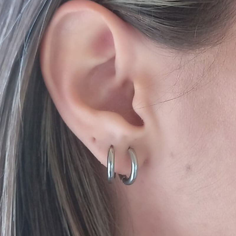 Σκουλαρίκια ατσάλινα ασημί χρώματος, κρικάκια, διαμέτρου 1,4 cm και πάχους 0,2 cm. Φοριούνται και σε ένα αυτί με πολλές τρύπες.