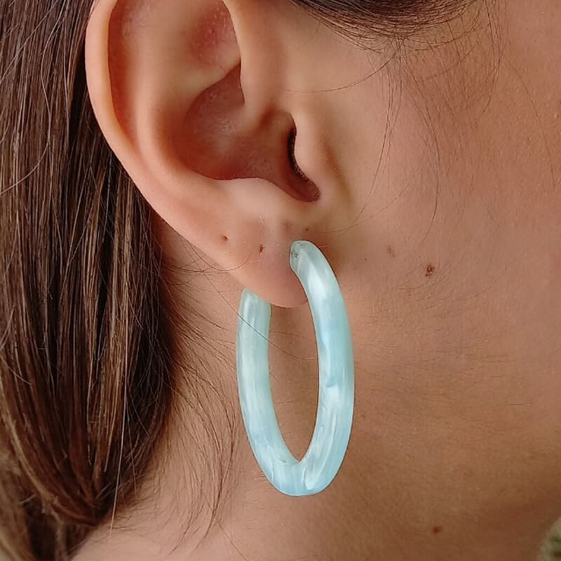 Σκουλαρίκια κρίκοι κοκάλινοι με ατσάλινο επίχρυσο “καρφάκι”, σε τυρκουάζ απόχρωση, μήκους 4,5 cm και πάχους 0,4 cm.