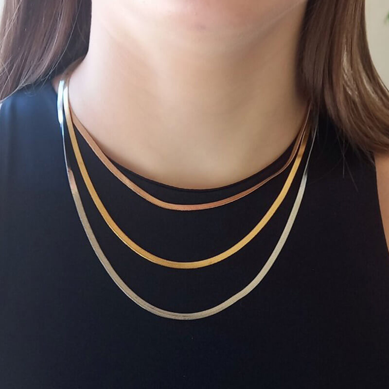Κολιέ ατσάλινο, τριπλής σειράς σε κλασσικό μοτίφ φιδιού, με κοινό κούμπωμα, πάχους 0,3 cm και διαδοχικά μήκους η ροζ χρυσή αλυσίδα 45 cm, η ασημί 50 cm και η χρυσή 55 cm,