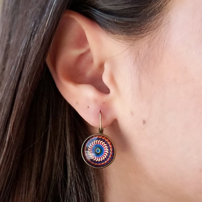 Σκουλαρίκια κρεμαστά, επίχρυσα από μπρούντζο, συνολικού μήκους 3,0 cm, διακοσμημένα με στρογγυλό στοιχείο 1,5 cm με συνδυασμό μπλε, κόκκινου, λευκού pattern και ρητίνης, vintage σχεδιασμού.
