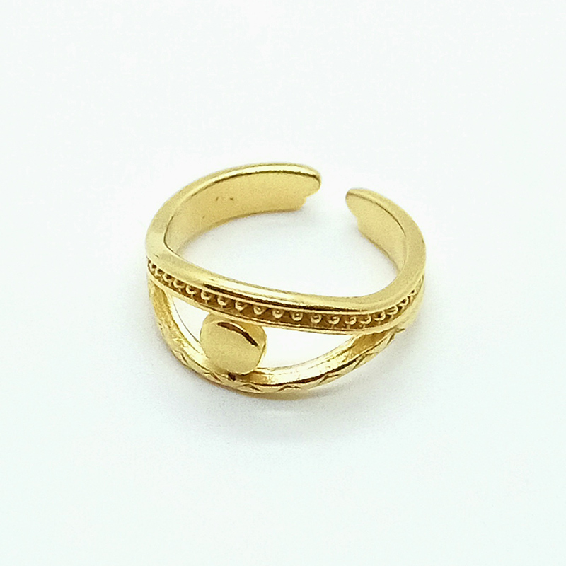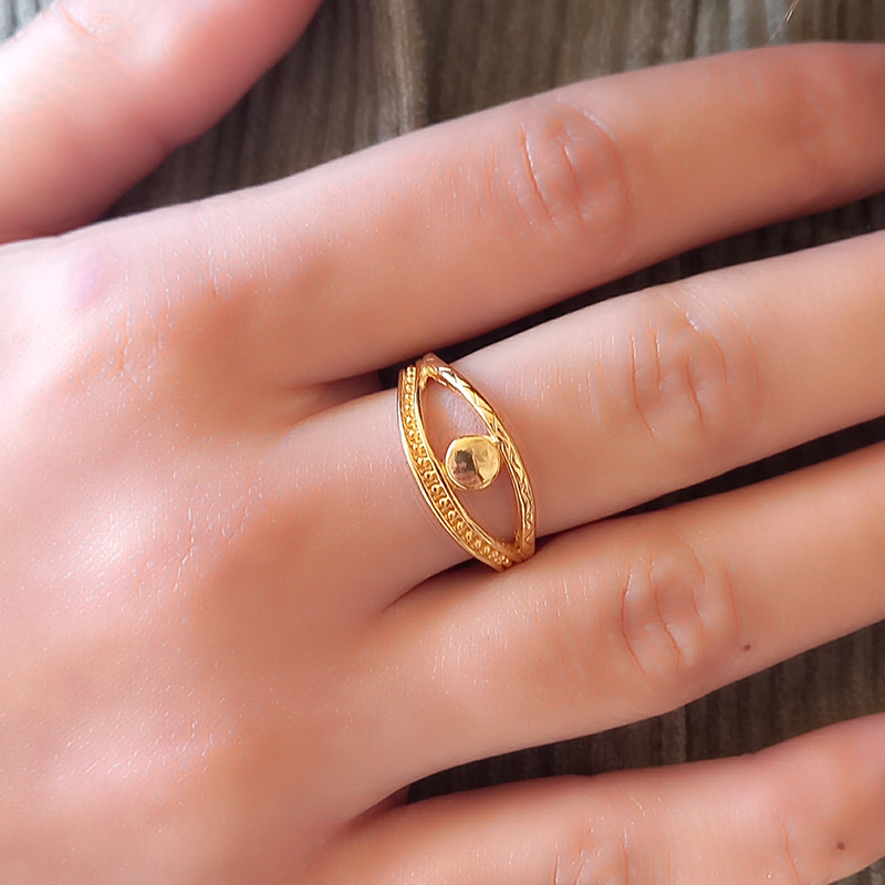 Δαχτυλίδι επιχρυσωμένου ορείχαλκου, διακοσμημένο στο κέντρο με διάτρητο μάτι, style ethnic, το οποίο προσαρμόζεται στο μέγεθος του δακτύλου.
