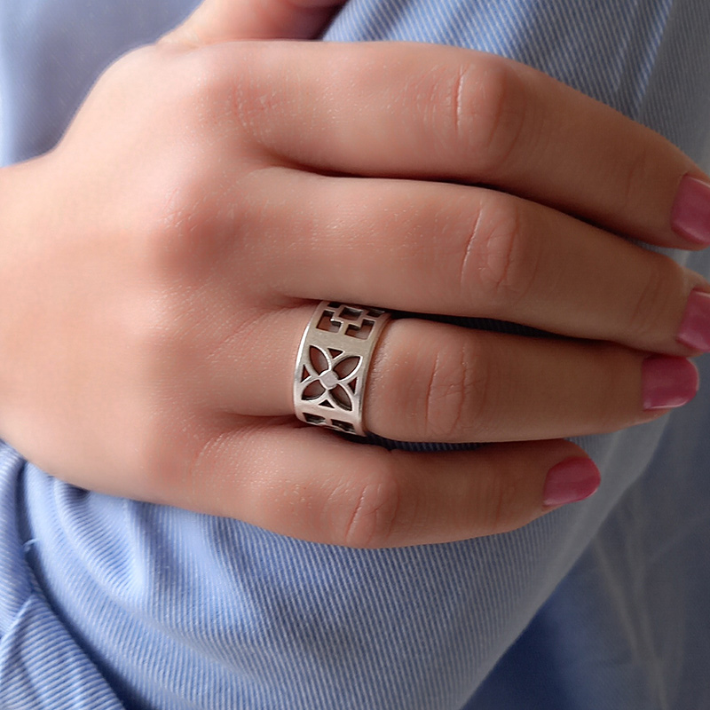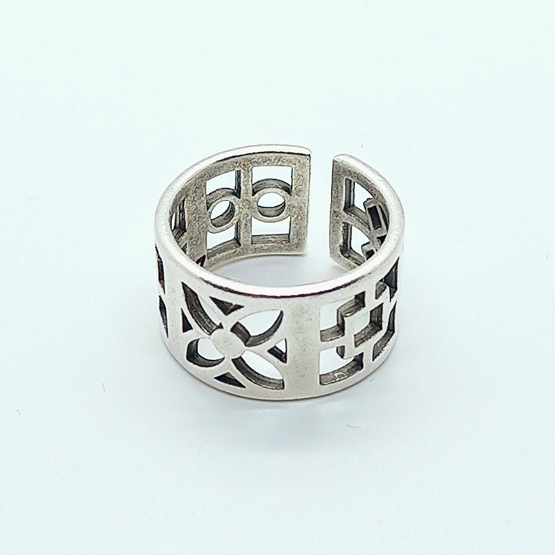 Δαχτυλίδι επαργυρωμένου ορείχαλκου, με διάτρητη διακόσμηση, το οποίο προσαρμόζεται στο μέγεθος του δακτύλου.