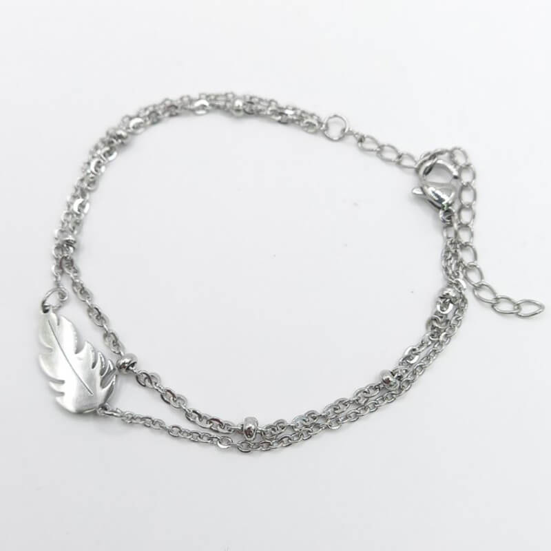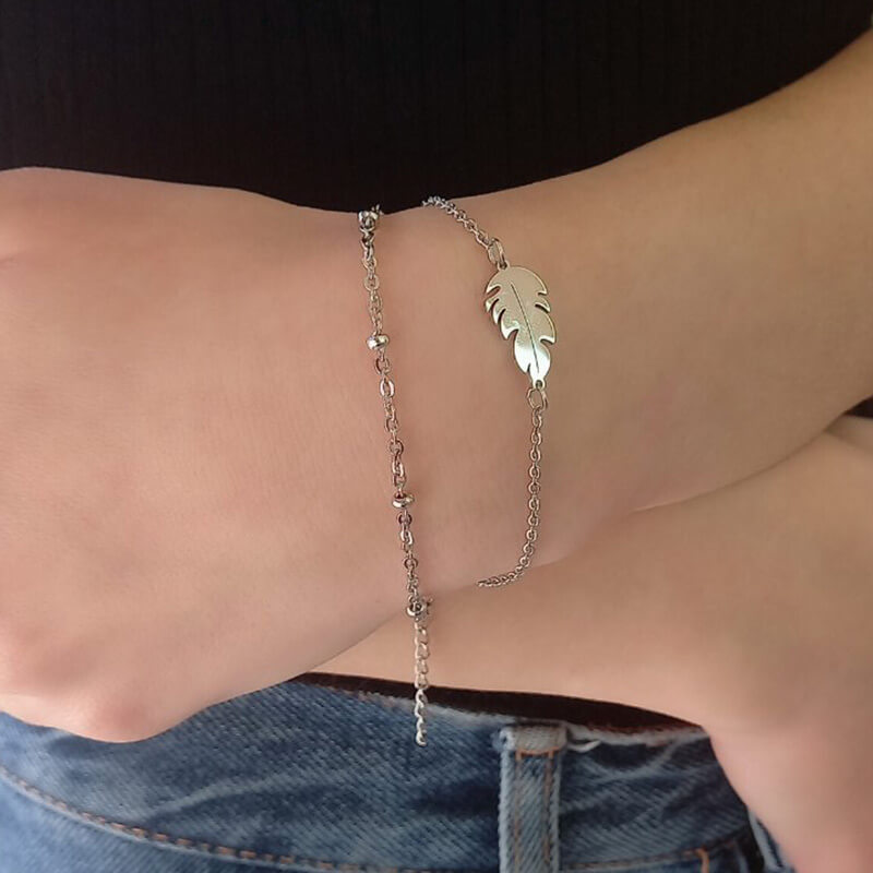 Βραχιόλι χεριού ατσάλινο, ασημί χρώματος σε διπλή αλυσίδα συνολικού μήκους 21 cm με κοινό κούμπωμα. Η μία διακοσμείται με στοιχείο “φύλλου” στο κέντρο της διαστάσεων 1,5 cm x 0,8 cm, ενώ η δεύτερη με μικρά μπιλάκια  ανά διαστήματα σε όλο το μήκος της.