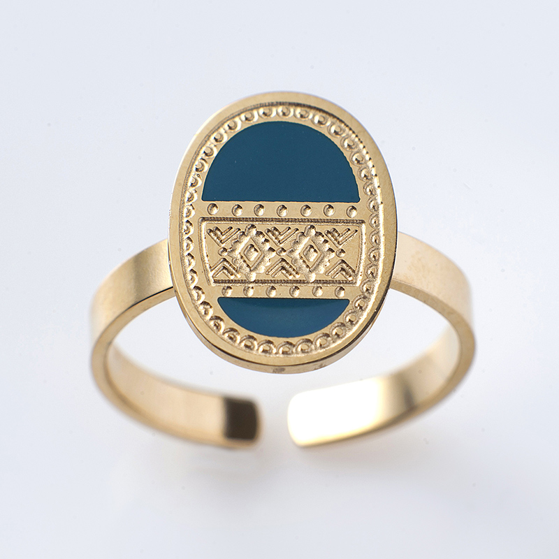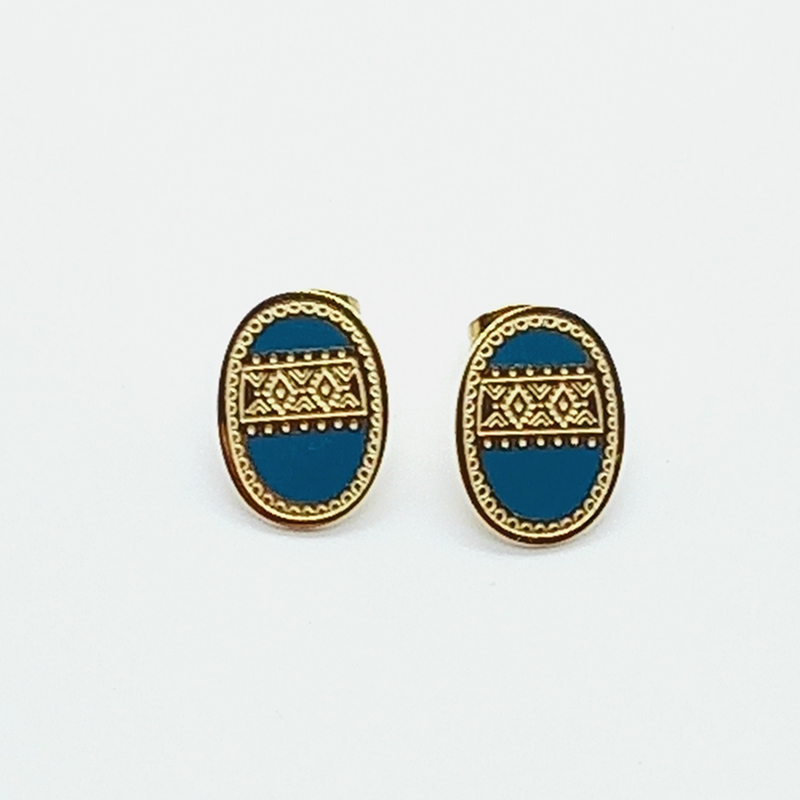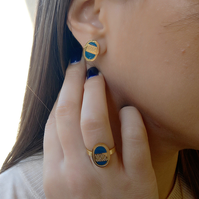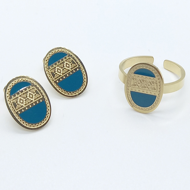 Set ethnic, από σκουλαρίκια και δαχτυλίδι ατσάλινα, επιχρυσωμένου ορείχαλκου σε οβάλ σχήμα, ψημένου σμάλτου οινοπνευματί χρώματος και χάραξη αρχαιοελληνικού τύπου