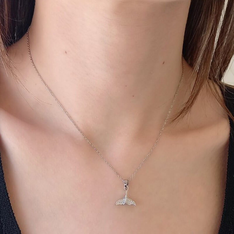 Κολιέ ατσάλινο σε ασημί χρώμα, σε αλυσίδα συνολικού μήκους 45 cm, η οποία συγκρατεί στοιχείο σχήματος ουράς γοργόνας διαστάσεων 1 cm x 1 cm, διακοσμημένο με strass.