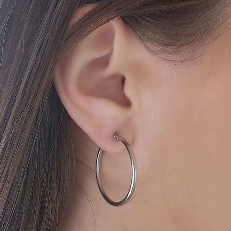 Σκουλαρίκια ατσάλινα, κλασικοί κρίκοι ασημί χρώματος, διαμέτρου 3 cm.