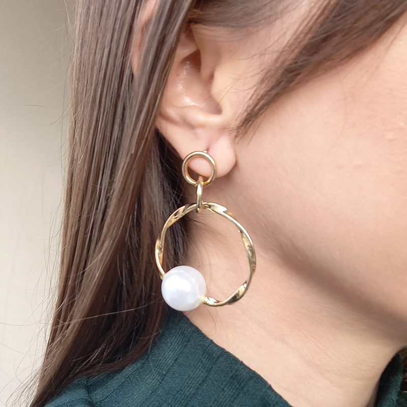 Σκουλαρίκια επιχρυσωμένου ορείχαλκου, σε σχήμα στριφτού κρίκου, με στριφτό μοτίφ, διαμέτρου 3,5 cm, και διακόσμηση λευκής περαστής στον κρίκο πέρλας. Διαθέτουν κούμπωμα καρφάκι.