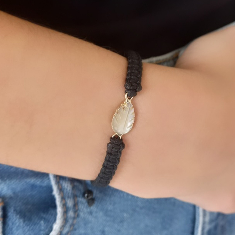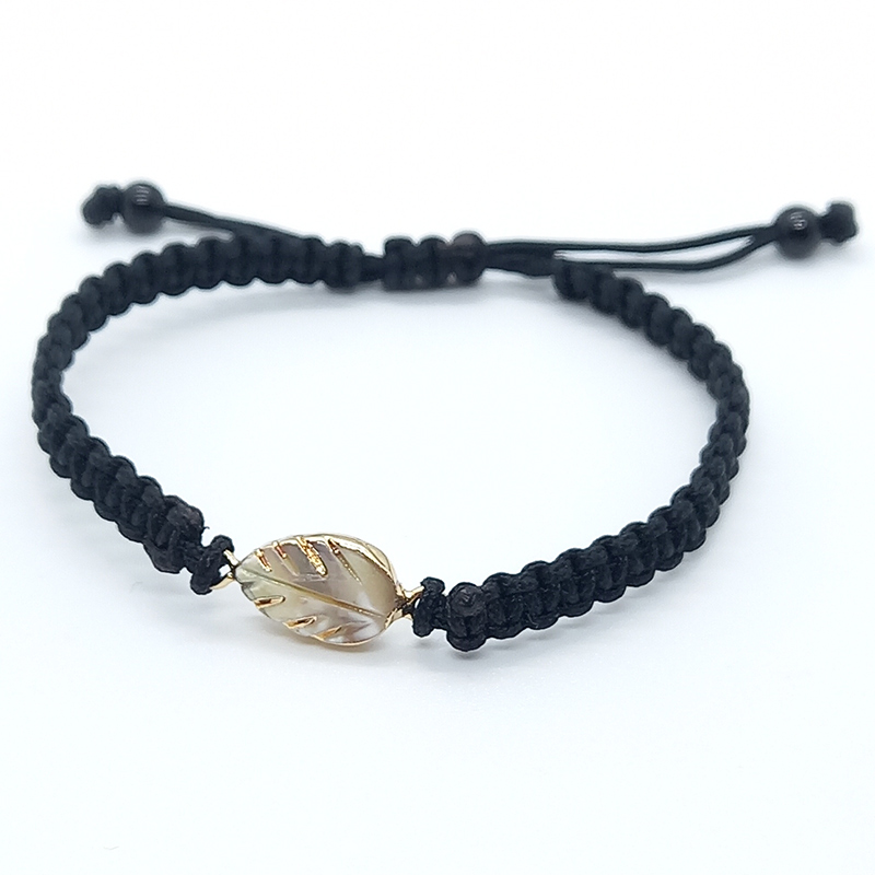 Βραχιόλι χεριού μακραμέ σε μαύρο χρώμα, διακοσμημένο με στοιχείο επεξεργασμένου κοχυλιού σε σχήμα φύλλου σε μπεζ χρώμα.