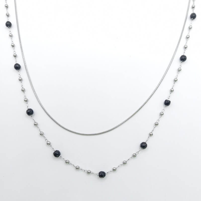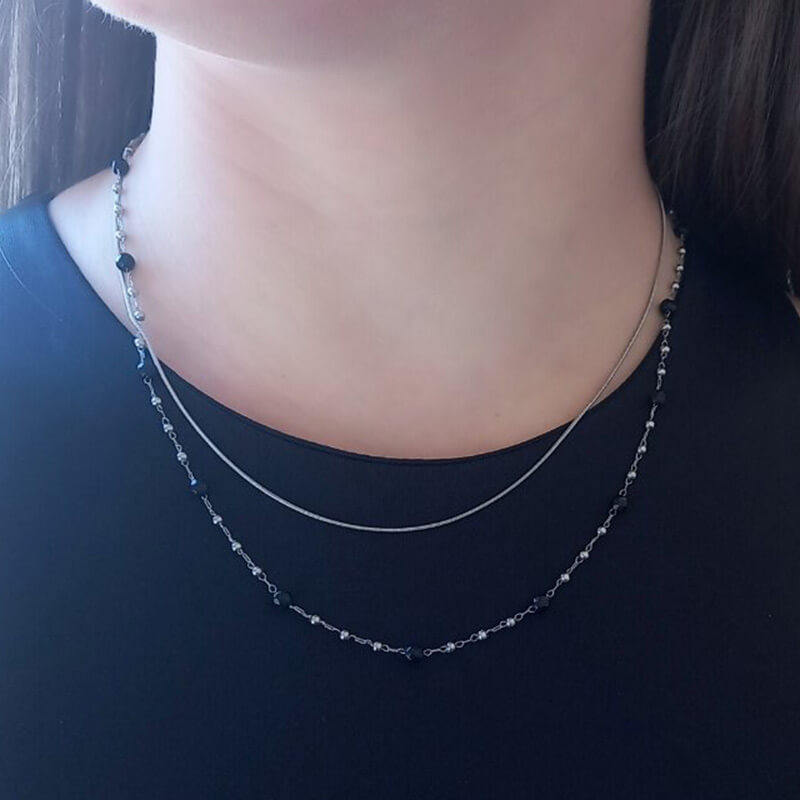Κολιέ από ατσαλί ασημί χρώματος, διπλής σειράς με κοινό κούμπωμα. Η πρώτη αλυσίδα σε στρογγυλό σχήμα μήκους 45 cm, ενώ η δεύτερη σε όλο το μήκος 50 cm διακοσμείται με ασημί μπιλάκια και μαύρα κρυσταλλάκια.