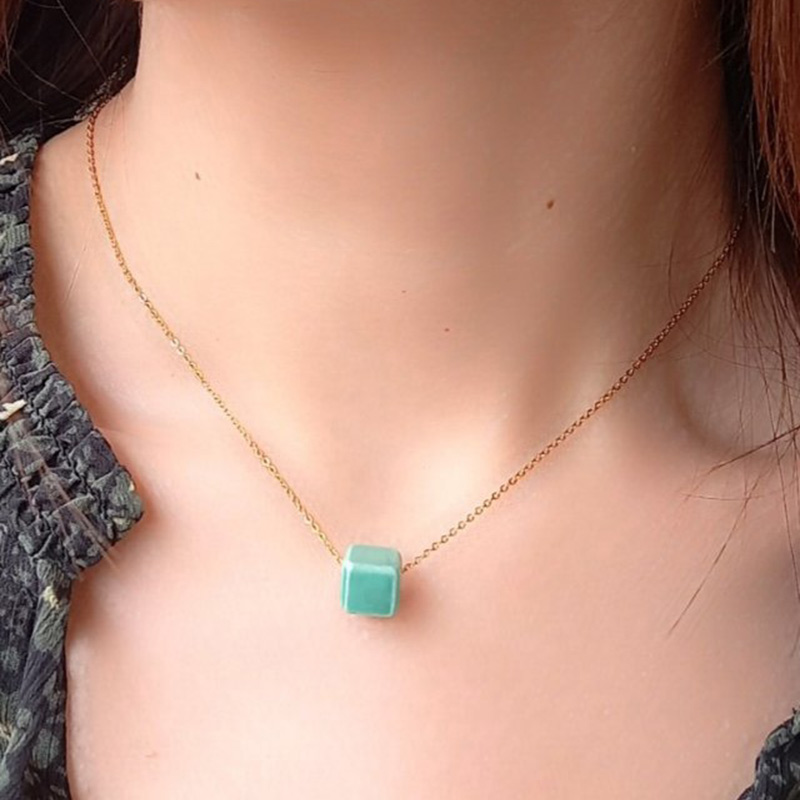 Κολιέ από ατσάλι σε χρυσό χρώμα, σε αλυσίδα μήκους 46 cm, η οποία συγκρατεί κεραμική χάντρα σχήματος κύβου στο χρώμα της μέντας.