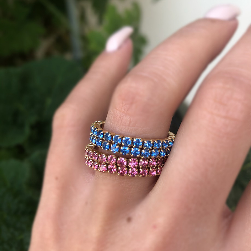 Δαχτυλίδι επιχρυσωμένου ορείχαλκου, τύπου βέρας διακοσμημένο με διπλή σειρά strass γαλάζιου χρώματος, το οποίο προσαρμόζεται στο μέγεθος του δακτύλου.