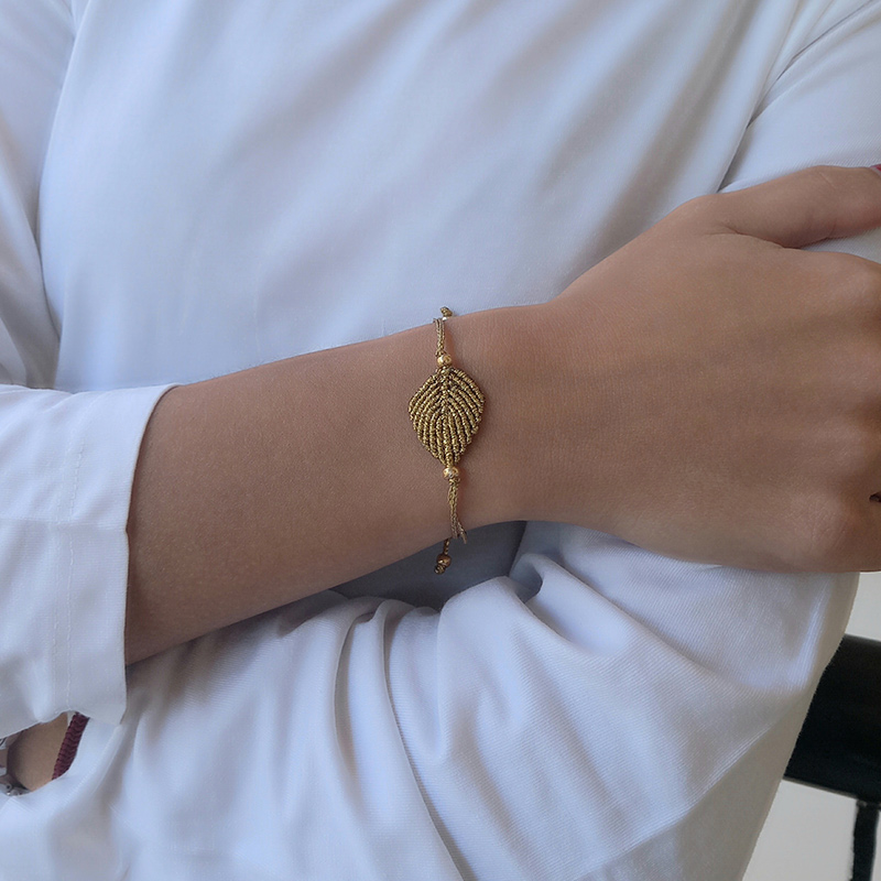 Βραχιόλι χεριού, χειροποίητο μακραμέ με χρυσή κλωστή, διακοσμημένο με σχήμα φύλλου διαμέτρου 3 cm.