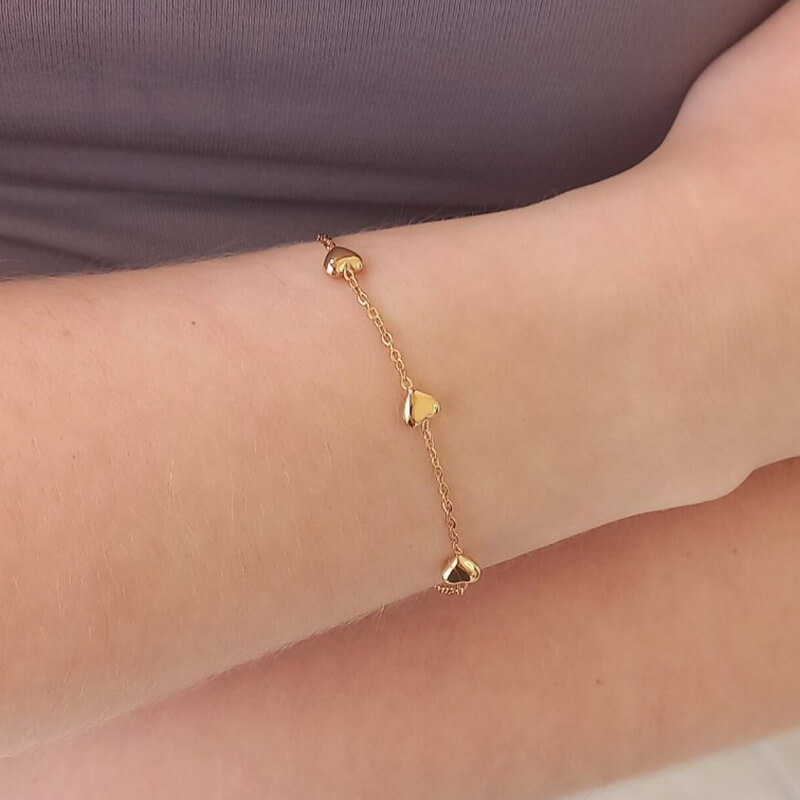 Βραχιόλι χεριού ατσάλινο, χρυσού χρώματος, αλυσίδα συνολικού μήκους 19 cm η οποία συγκρατεί τρεις καρδούλες 0,6 cm κατά μήκος της.