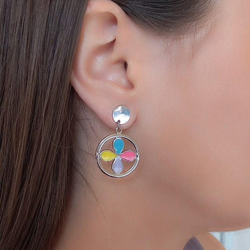 Σκουλαρίκια από ατσάλι ασημί χρώματος, τα οποία σε στοιχείο διαμέτρου 0,8 cm συγκρατούν στρογγυλό στοιχείο διαμέτρου 2 cm διακοσμημένο στο κέντρο του διάτρητο λουλούδι από σμάλτο σε συνδυασμό χρωμάτων. Διαθέτουν κούμπωμα “καρφάκι”.