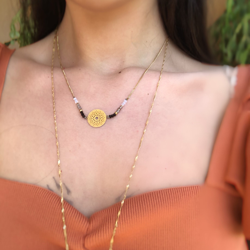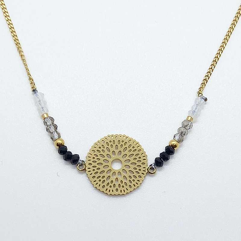 Κολιέ από ατσάλι, χρυσού χρώματος, με αλυσίδα μήκους 49cm, η οποία καταλήγει σε κρυστάλλους και συνδέει διάτρητο στοιχείο στρογγυλού σχήματος διαμέτρου 1,7cm.