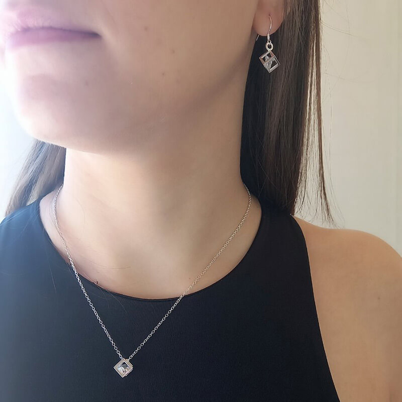 Set από κολιέ και σκουλαρίκια σε ασήμι 925, σε σχήμα κύβου διακοσμημένα με κρυσταλλάκια λευκού χρώματος. Το κολιέ σε αλυσίδα συνολικού μήκους 45 cm, συγκρατεί στοιχείο σχήματος κύβου 0,8 cm, το οποίο στο κέντρο του διακοσμείται με λευκό κρυσταλλάκι. Αντίστοιχα, σκουλαρίκια κρεμαστά συνολικού μήκους 2,5 cm.
