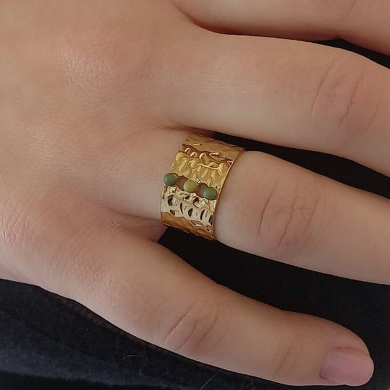 Δαχτυλίδι ατσάλινο χρυσού χρώματος, σφυρήλατο, πάχους 1,1 cm το οποίο διακοσμείται με τρία διακοσμητικά μπιλάκια σε αποχρώσεις του πράσινου χρώματος. Προσαρμόζεται στο μέγεθος του δακτύλου.
