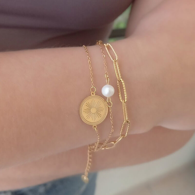 Βραχιόλι χεριού ατσάλινο, χρυσού χρώματος τριπλής σειράς, συνολικού μήκους 20 cm. Η μία αλυσίδα κλασικού μοτίφ, η δεύτερη συγκρατεί στοιχείο πέρλας και η Τρίτη εγχάρακτο ήλιο διαμέτρου 1,5 cm.