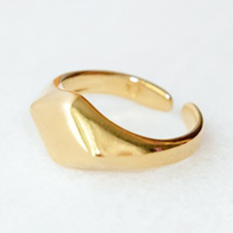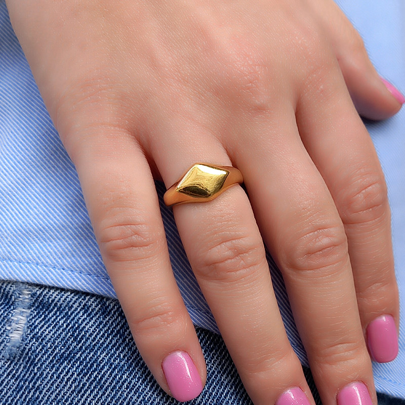 Δαχτυλίδι επιχρυσωμένου ορείχαλκου, σχεδιασμού πλακέ σχήματος ρόμβου, το οποίο προσαρμόζεται στο μέγεθος του δακτύλου.