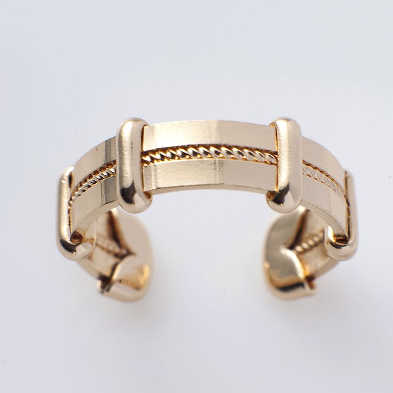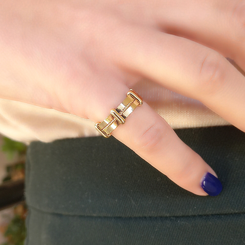Δαχτυλίδι επιχρυσωμένου ορείχαλκου, σε χρυσό χρώμα, διακοσμημένο με χαρακτικές λεπτομέρειες αλυσίδας, το οποίο προσαρμόζεται στο μέγεθος του δακτύλου.