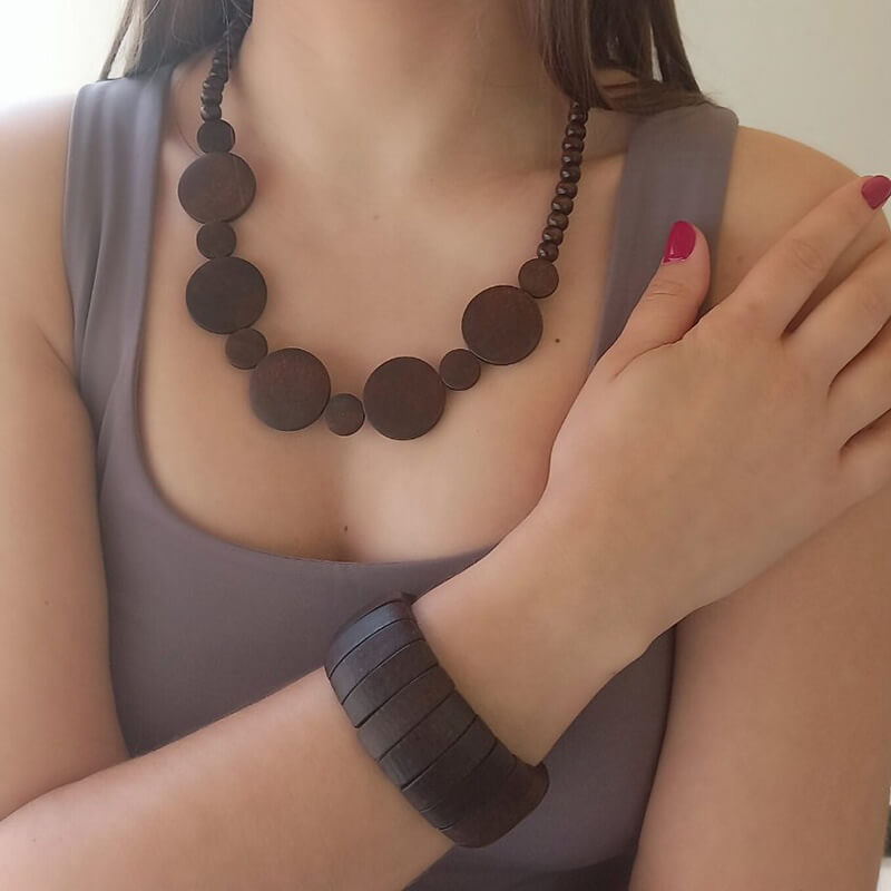 Set από κολιέ και βραχιόλι χεριού, από ξύλο με μπάρες και ροζέτες.
