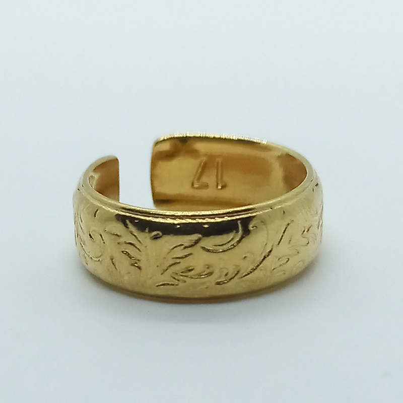 Δαχτυλίδι επιχρυσωμένου ορείχαλκου, με μικρές χαρακτικές λεπτομέρειες, το οποίο προσαρμόζεται στο μέγεθος του δακτύλου.