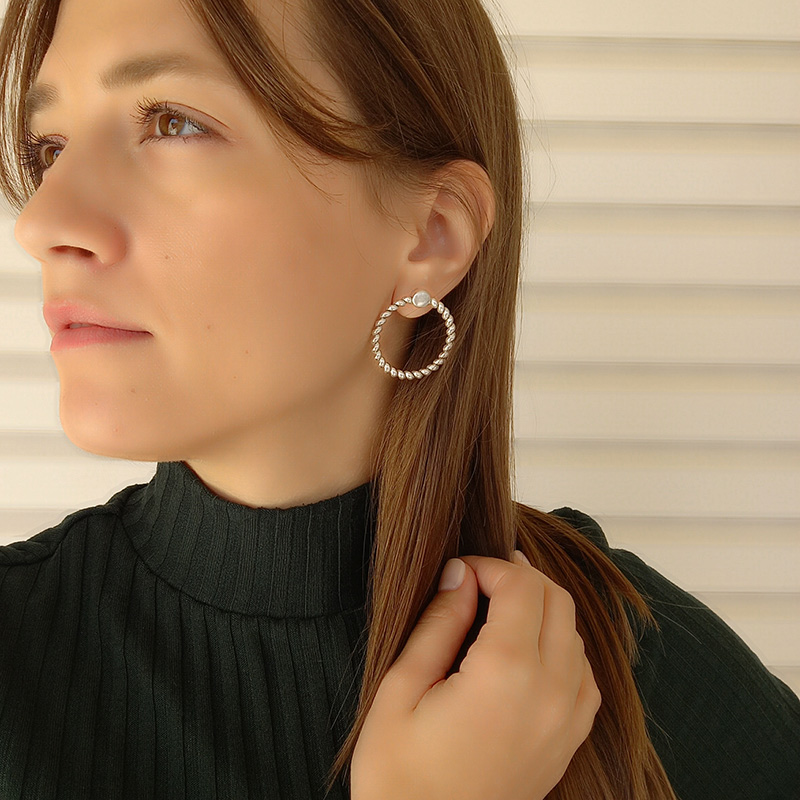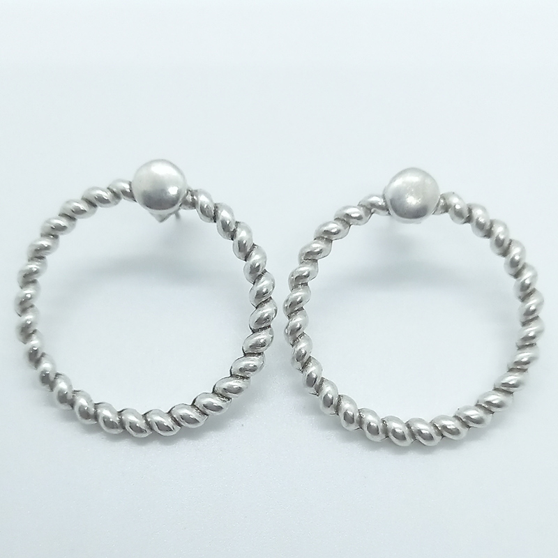 Σκουλαρίκια επαργυρωμένου ορείχαλκου, με σχέδιο στιφτών κρίκων διαμέτρου 3 cm, με καρφί τιτανίου και πεταλούδα από ατσάλι.