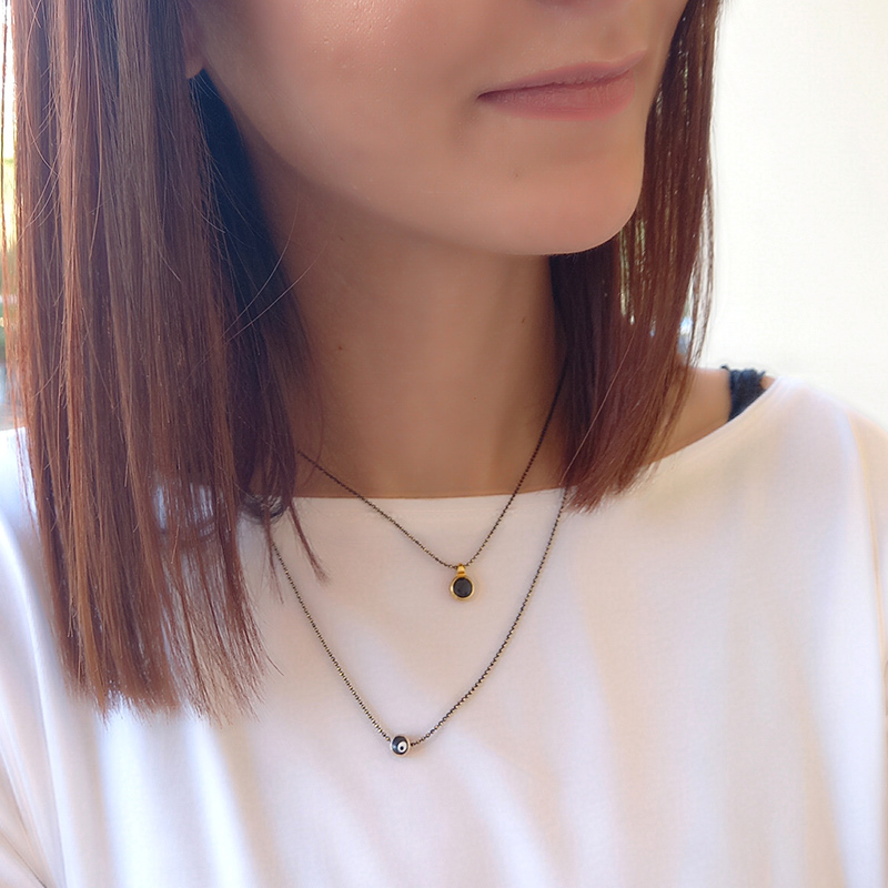 Κολιέ επιχρυσωμένου ορείχαλκου διπλής σειράς με κοινό κούμπωμα. Η πρώτη αλυσίδα μήκους 41cm, ενώ η δεύτερη μήκους 50cm και προέκταση 5cm, σε μαύρο επιχρυσωμένο ορείχαλκο συγκρατούν, η μεν μικρή στοιχείο μαύρου ψημένου σμάλτου και η μεγαλύτερη ματάκι.