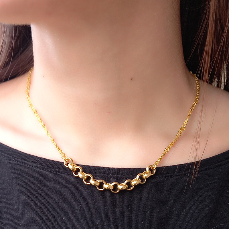 Κολιέ με αλυσίδα κλασικού μοτίφ διπλής σειράς επιχρυσωμένου ορείχαλκου χρυσού χρώματος. Η κάθε αλυσίδα έχει μήκος 34cm και ενώνεται με αλυσίδα επιχρυσωμένου ορείχαλκου μήκους 6cm.