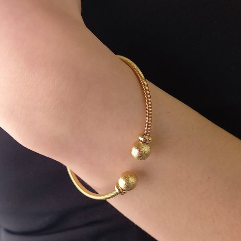Βραχιόλι χεριού ατσάλινο, χρυσού χρώματος, χειροπέδα σε κλασσικό μοτίφ βέργας ,η οποία στα τελειώματά της διακοσμείται με δύο ματ μπίλιες διαμέτρου 0,7 cm.