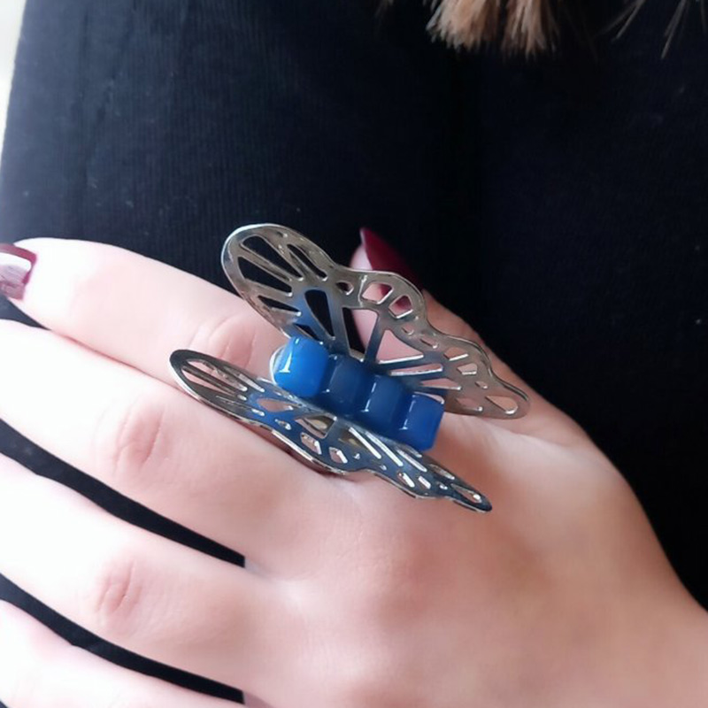 Δαχτυλίδι από ασήμι 925, σε νούμερο 18, μοναδική, χειροποίητη κατασκευή. Διακοσμείται από πεταλούδα με πέτρες αχάτη μπλε χρώματος. Η κατασκευή των φτερών είναι ξεχωριστή και στηρίζεται σε ειδική υποδοχή πάνω στο δακτύλιο. Το μήκος των φτερών είναι 5,5 cm και το άνοιγμά τους 3,5 cm.