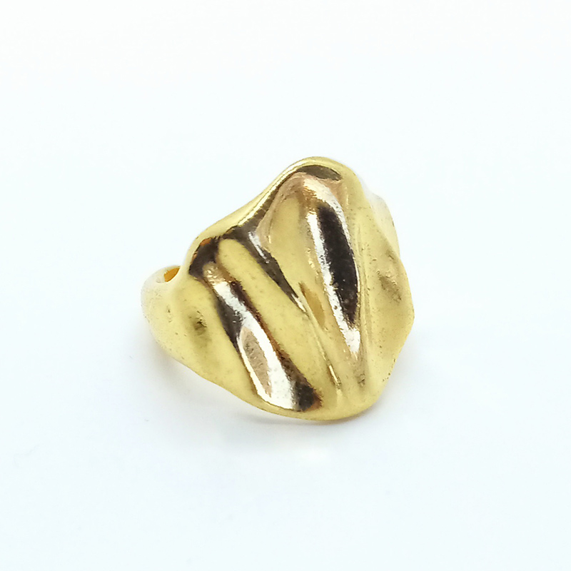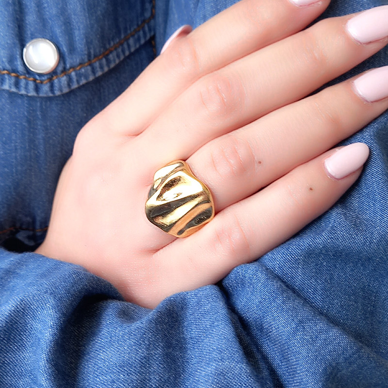 Δαχτυλίδι επιχρυσωμένου ορείχαλκου, σε χρυσό χρώμα με σχέδιο ελαφρύ κυματισμού, το οποίο προσαρμόζεται στο μέγεθος του δακτύλου.