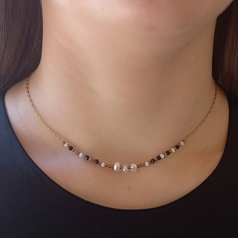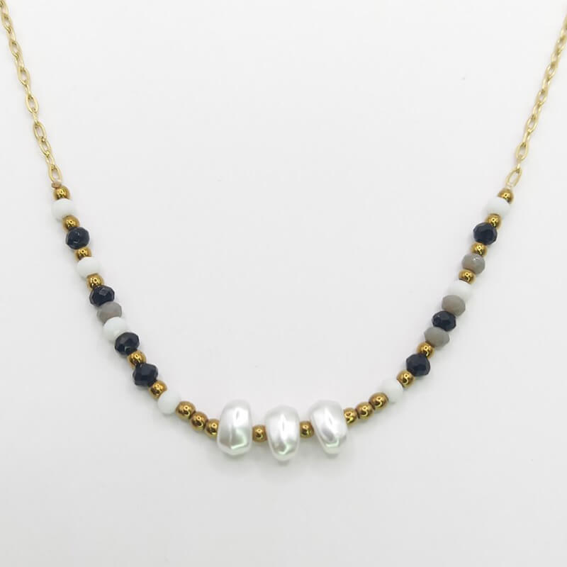 Κολιέ αλύσιδας από ατσάλι, χρυσού χρώματος, συνολικού μήκους 47 cm, η οποία διακοσμείται με τρία μαργαριτάρια και χάντρες σε χρωματισμό χρυσό, μαύρο, γκρι και λευκό.